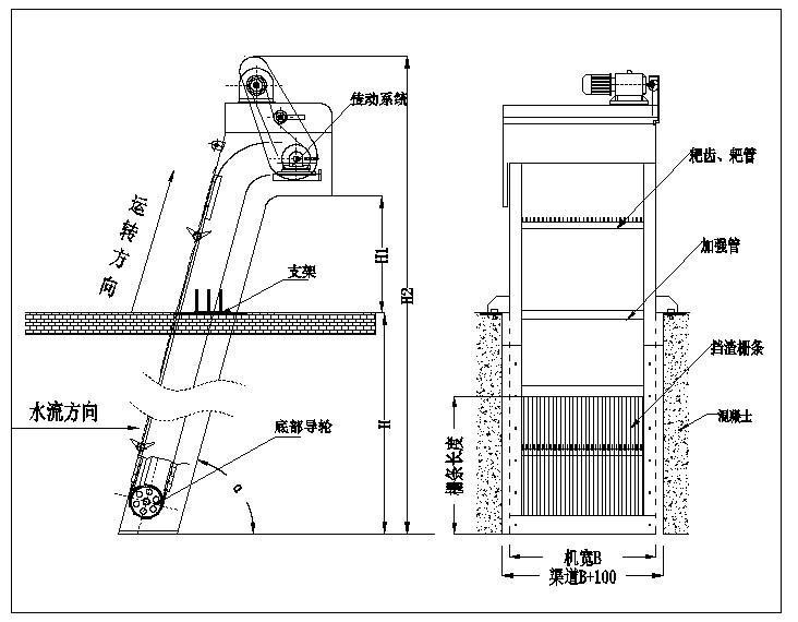 B=机宽; H=渠深; H1=出渣高度; H2=H+H1+2000; α=安装角度。