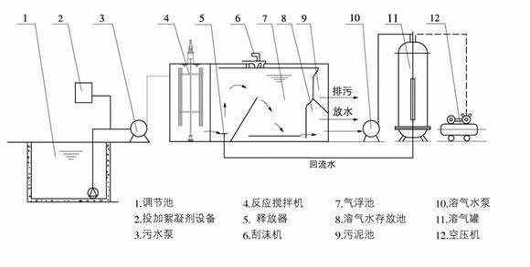 目前使用广泛的是部分处理水回流加压溶气气浮,其工艺流程如图所示,该法将部分处理出水(20~50%)回流,送往压力溶气罐,使空气充分溶于水中,然后经过释放器后与絮凝后的原水混合进入气浮池。该法处理效果稳定,并能大量节约能耗,在污水处理工艺中应用多。